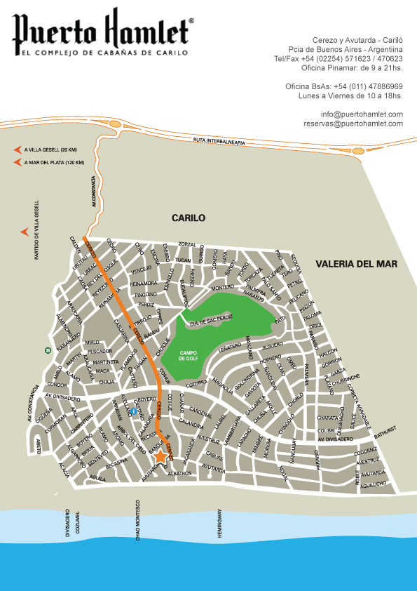 Cerezo es la calle principal de Cariló y el acceso desde la Ruta 11. Ingresando a Cariló por Cerezo y después de pasar por el centro comercial, 100 metros antes de llegar a la playa y en la intersección con la calle Avutarda, usted se encontrará con Puerto Hamlet. Cuatro bloques de dos plantas, techos de pizarra a cuatro aguas, arquitectura nórdica tapizada de plantas y enredaderas. A 300 metros del centro comercial y a 100 metros de la playa, un lugar cómodo, práctico pero a la vez alejado del bullicio del centro en las noches de temporada alta.
